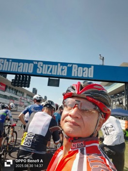シマノスズカ30分エンデューロ、スタート地点のサイコンは45℃でした、前から4列目と好位置からスタートで申し訳ない、今回は高心拍でのレースは無理とわかっているので、4周回を目標で、14時55分スタート、シケインを心拍を抑えて抜けて、さあ加速という50mほど先のライン上で落車発生、1000人程走っているので止まるのも危険、左は流れているので無理、右のコース外の芝から抜けて再加速、自分のペースに合うところで進める。1周10分ぐらい、2周目の裏ストレートでドリンクが枯渇、待ち時間が長くて飲み過ぎた、2周目も10分ぐらい、体のいっぱいのところで3周目を帰ってくると30分過ぎてました、終了、リザルトはレースになりませんでしたが、この暑い夏を夏バテせずに、落車せずに終わったので、悔しいけど良しとしときます。