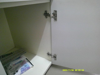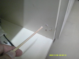 2枚目の画像は男子トイレの手洗い場の下の扉。閉まらなくなったとのこと。この蝶番は100度以上開かないのに無理やり開けると、この症状に。兆番のビス止めをするためにビス穴を割りばしで補修してから取り付け。