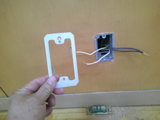 2.本校の板壁は中空で、2枚目の画像のプレートで固定してあった。ホームセンターで中空のボードに固定できるボックスを見つけたので、その大きさにボードを切り込みボックスを固定。
