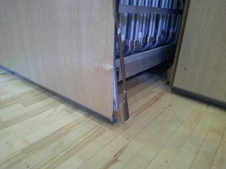 前面扉を取り外して外枠を取り外し、内側ステーを叩いてねるべく真っすぐに。外枠も叩いてみるが取り付けられる状態には無理があり外枠は外して前面扉を取り付け。
